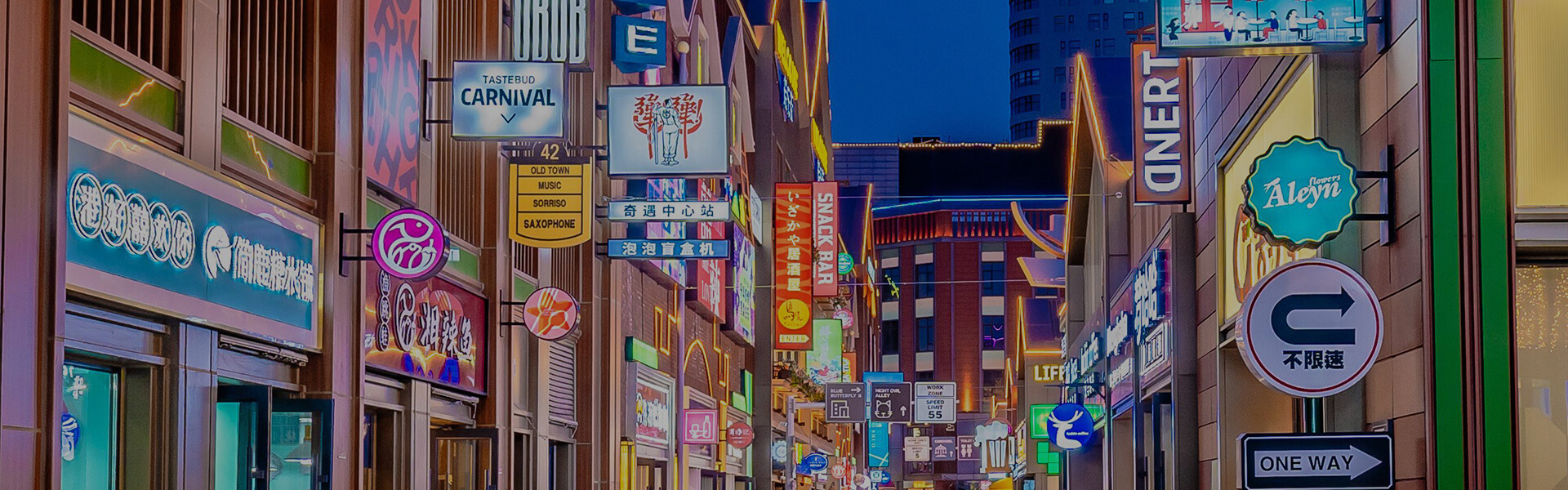 我們在場景中運(yùn)用走字屏去勾勒出建筑的轉(zhuǎn)角;用燈箱和廣告等等去化解單調(diào)的建筑形式;